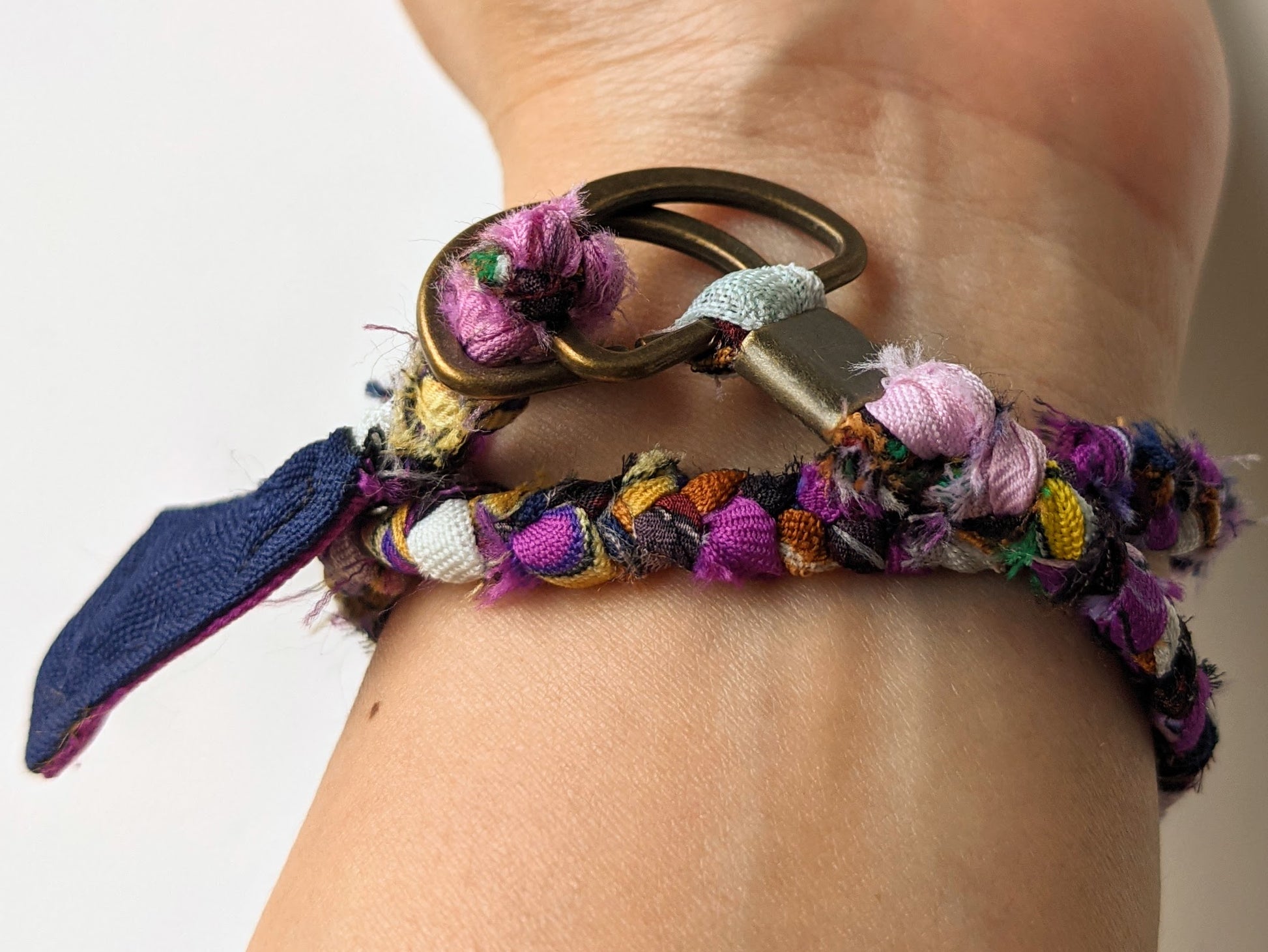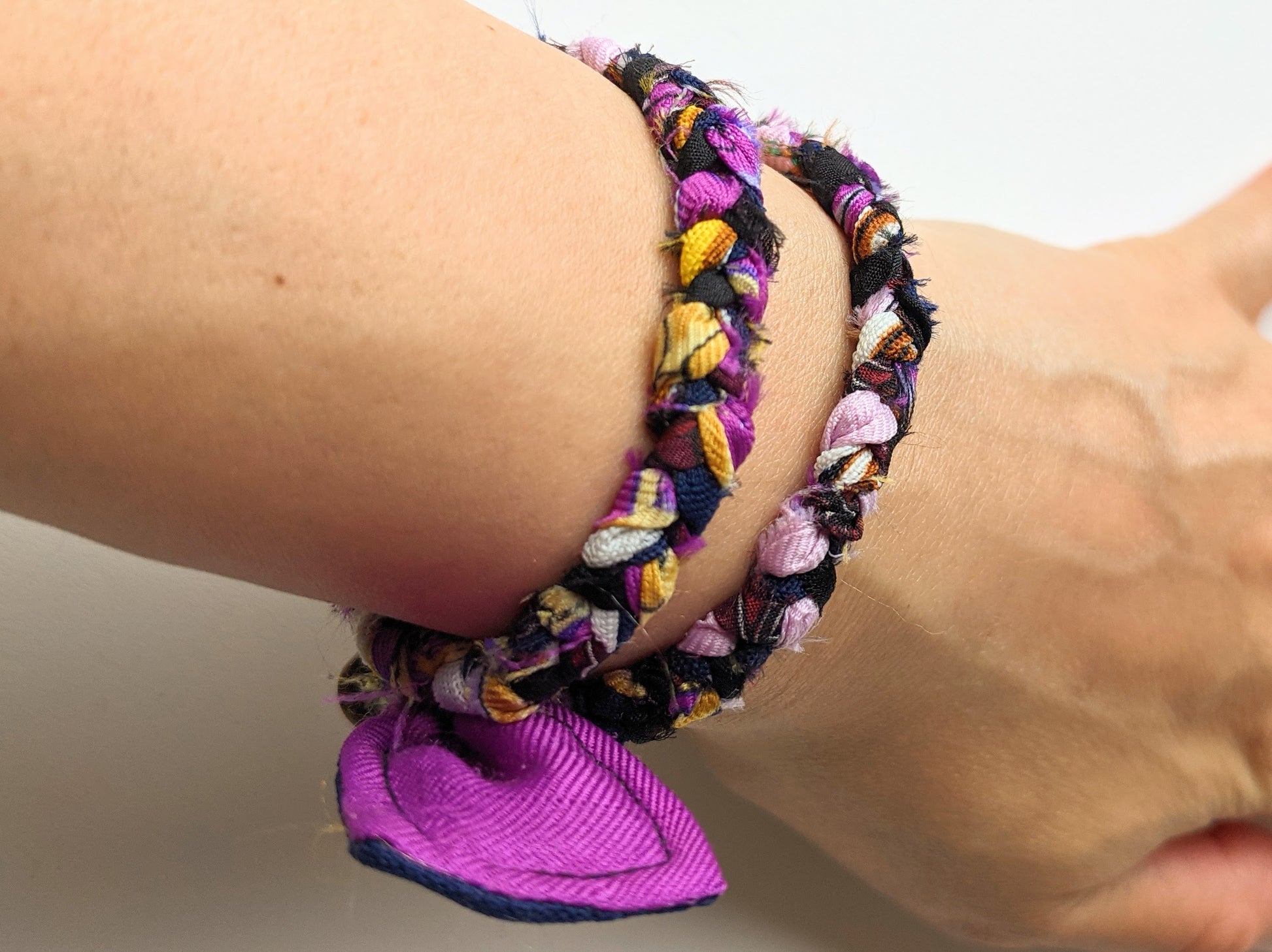 古いスカーフなどを細く裁断し一点一点丁寧に三つ編みして仕上げられたブレスレット。