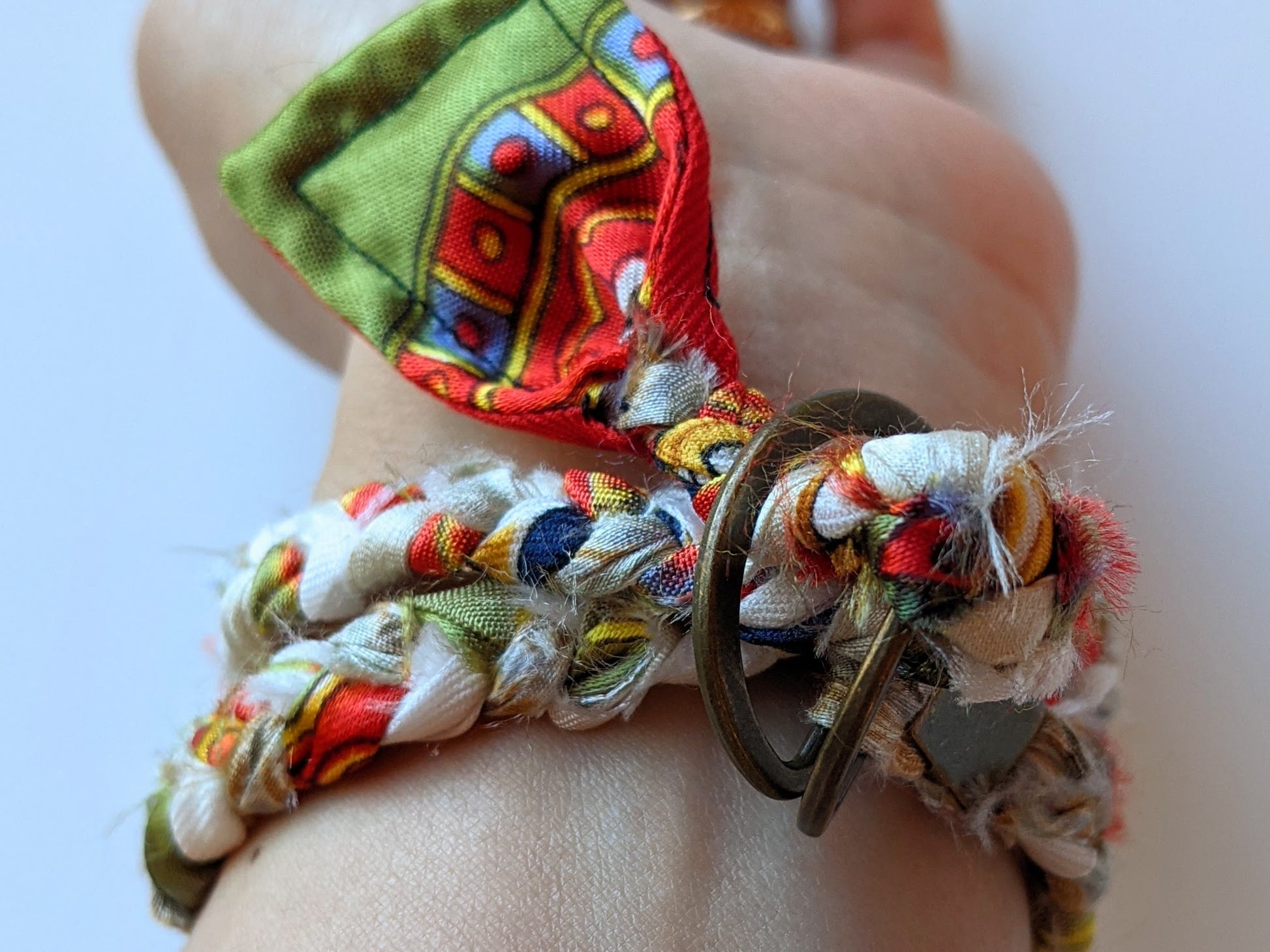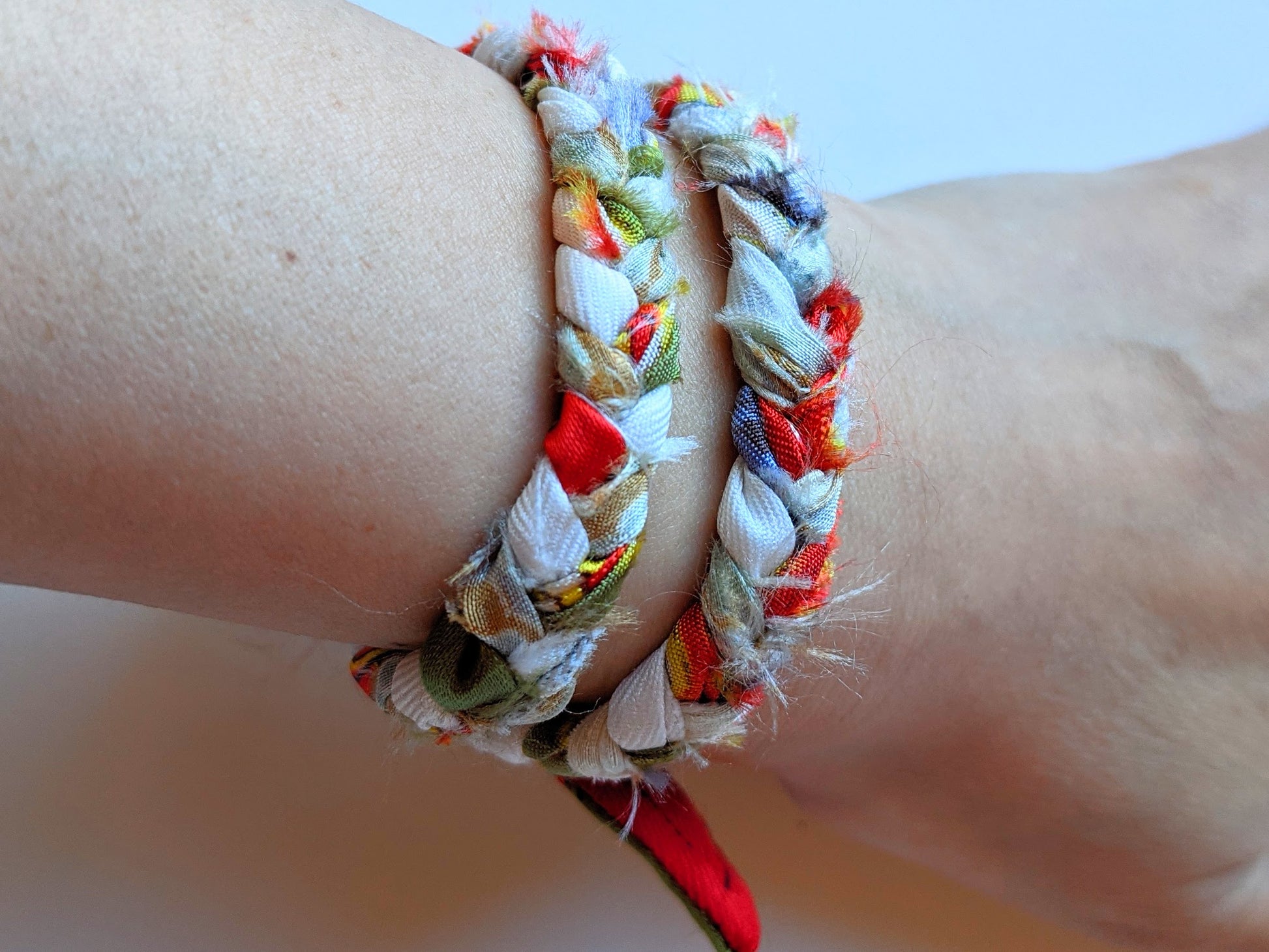 古いスカーフなどを細く裁断し一点一点丁寧に三つ編みして仕上げられたブレスレット。