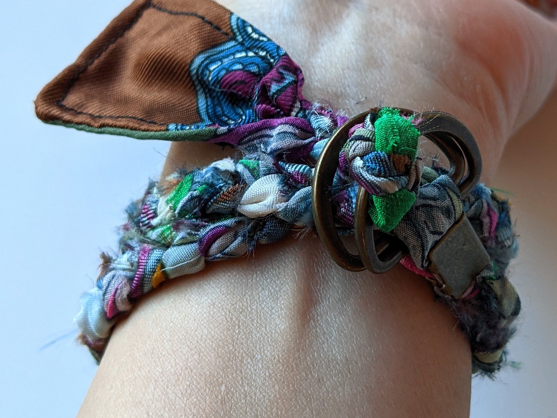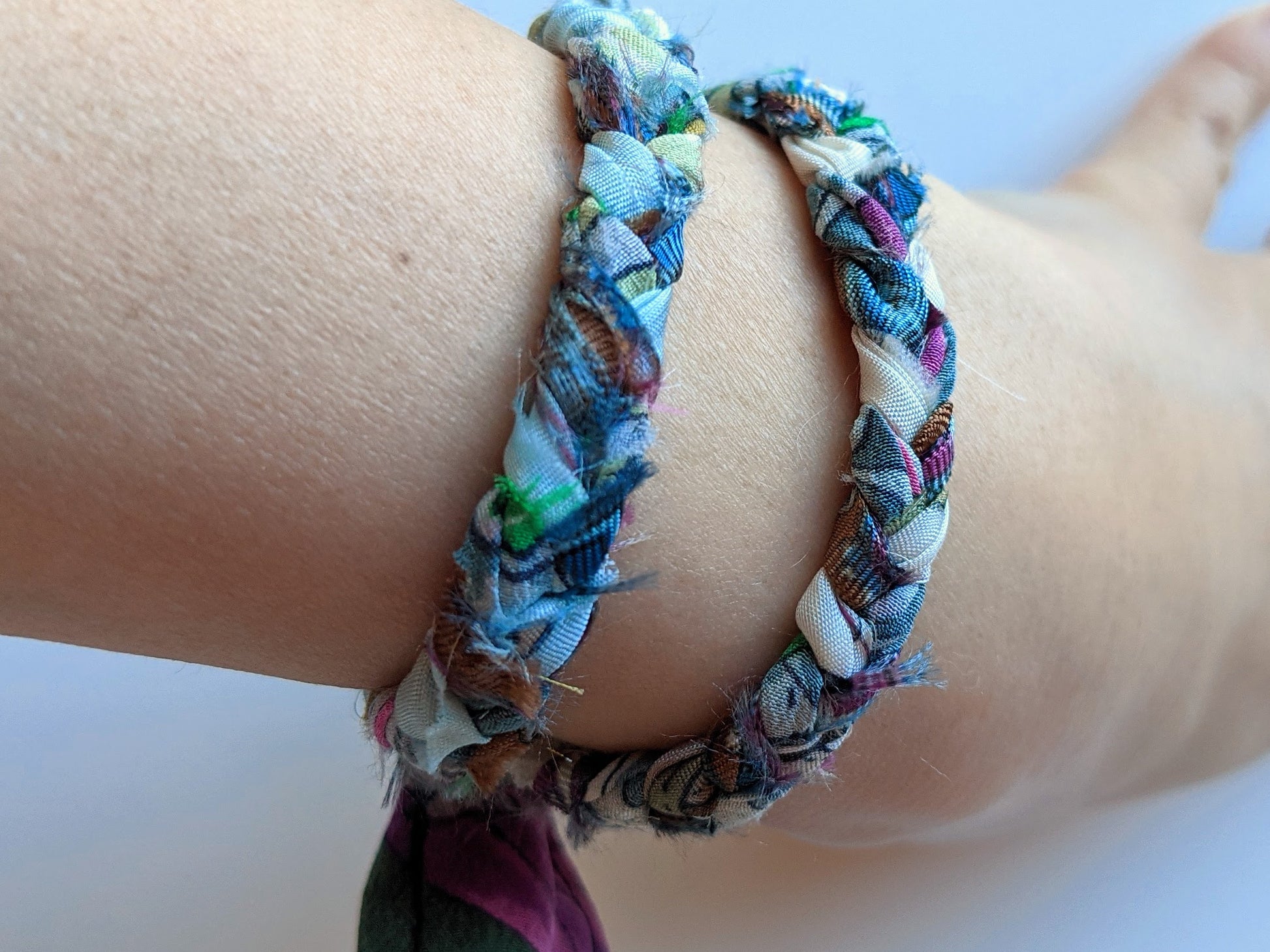 古いスカーフなどを細く裁断し一点一点丁寧に三つ編みして仕上げられたブレスレット。
