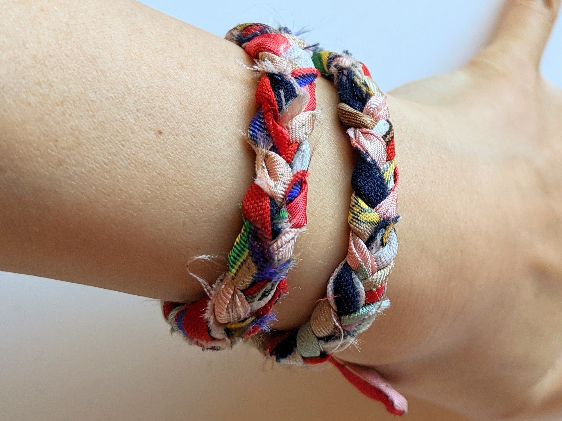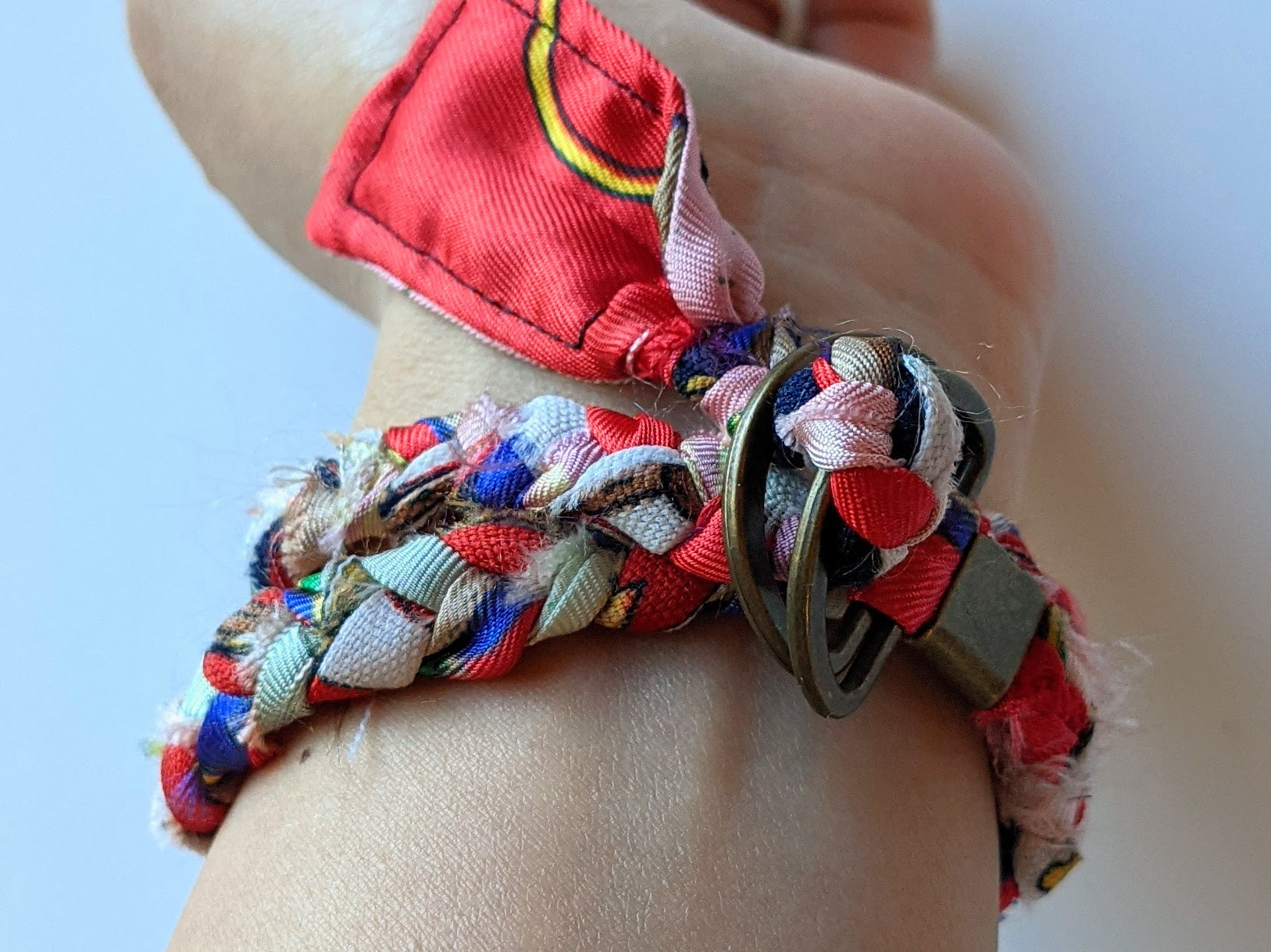古いスカーフなどを細く裁断し一点一点丁寧に三つ編みして仕上げられたブレスレット。